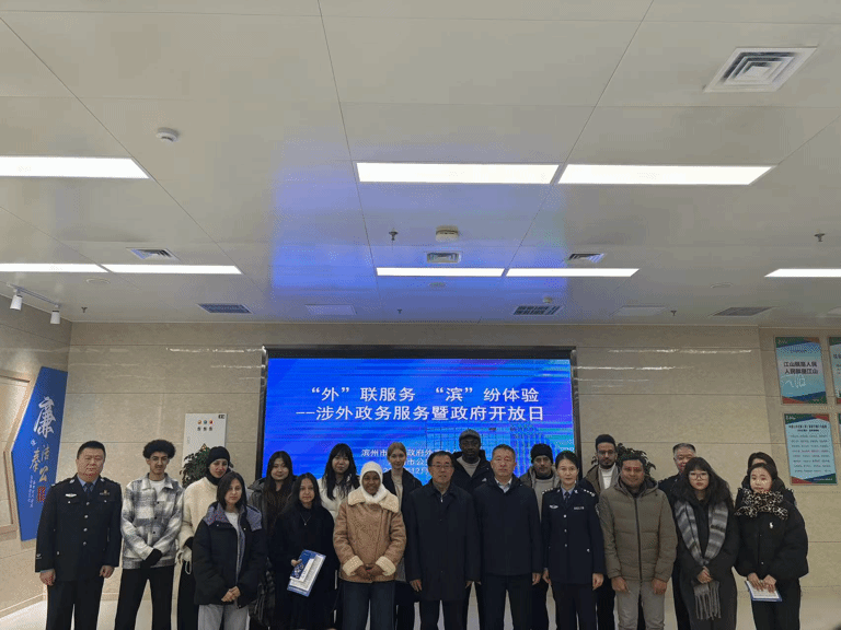 近日,我校留学生代表应邀参加由滨州市人民政府外事办公室举办的 “‘外’联服务 ‘滨’纷体验” 涉外政务服务暨政府开放日活动。在为期一天的行程中,留学生们通过政务参访、互动座谈与乡村走访,从城市服务窗口走进新农村建设一线,完成了一堂从 “观察” 到 “体验”、从 “感知” 到 “理解” 的中国发展实践课。
