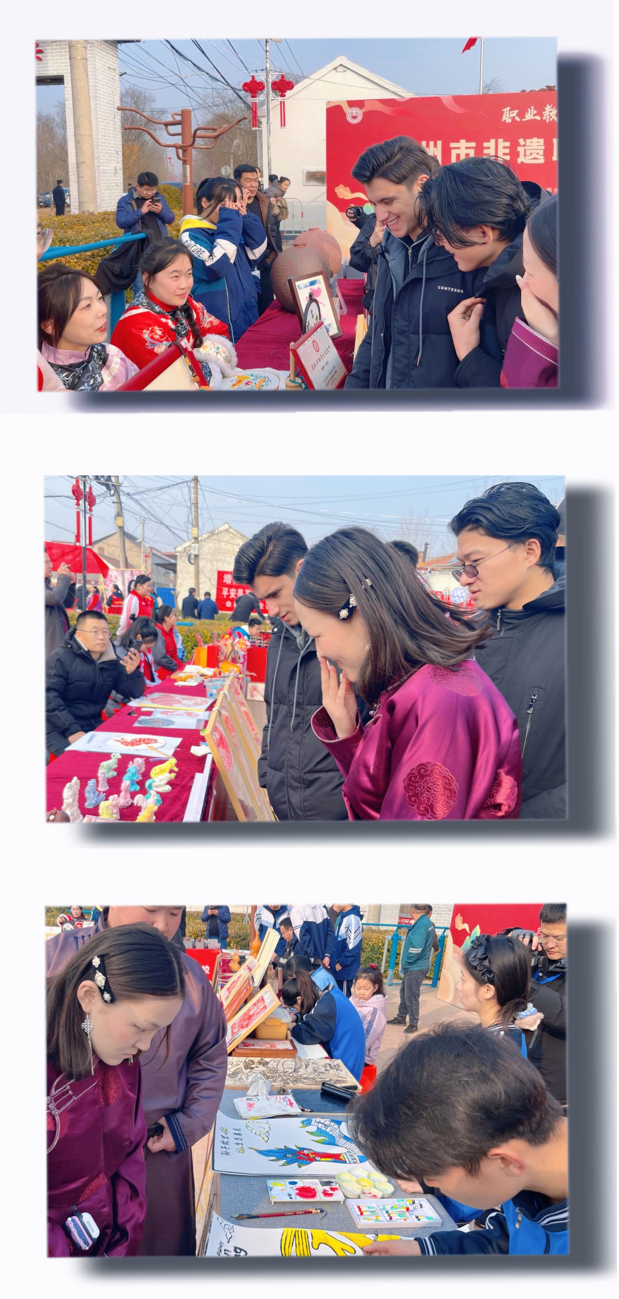 3月1日,“赶黄河大集,赏多彩非遗”第三届中国·滨州传统工艺大会暨滨州市非遗职业教育技能比赛在惠民县皂户李镇火把李村顺利开展。为探索非遗魅力,共筑文化交流桥梁,我院组织留学生参与了此次文化交流活动。