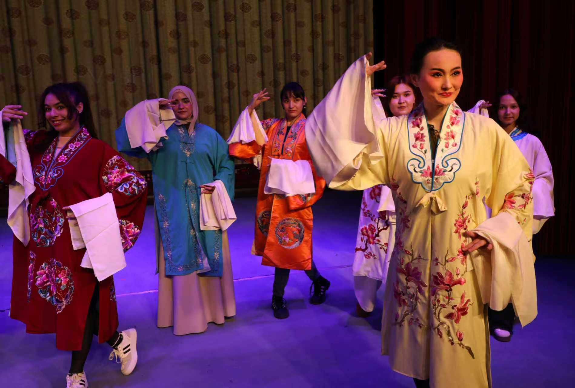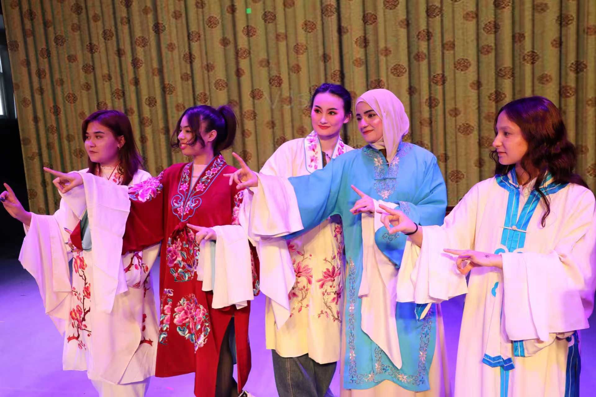 3月23日下午,我院10名留学生在3名教师带领下走进博兴县剧团,共同参加第二届中国稀有剧种优秀剧目展演闭幕式,沉浸式体验吕剧魅力。在戏服体验区,留学生们换上戏服、学做身段,来自也门的马里克一边整理着水袖,一边笑着说:“感觉自己穿越到了中国古代的舞台上!”闭幕式上,滨州本土的大型东路梆子新编历史剧《荐官记》作为优秀剧目登台亮相。“虽然我听不懂他们在唱什么,但我能感受到那种情感,很真挚、很有力量。”来自阿富汗的吴远这样说道。