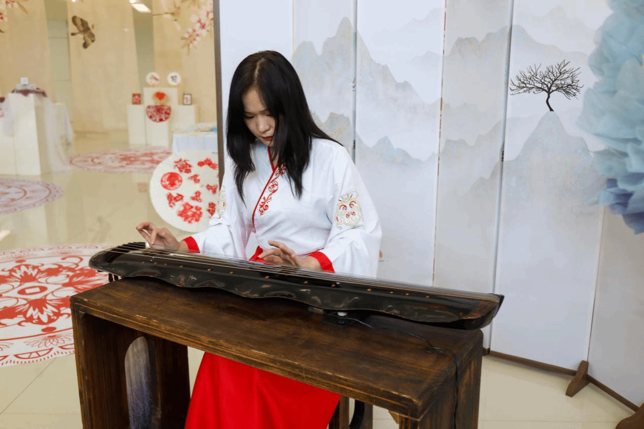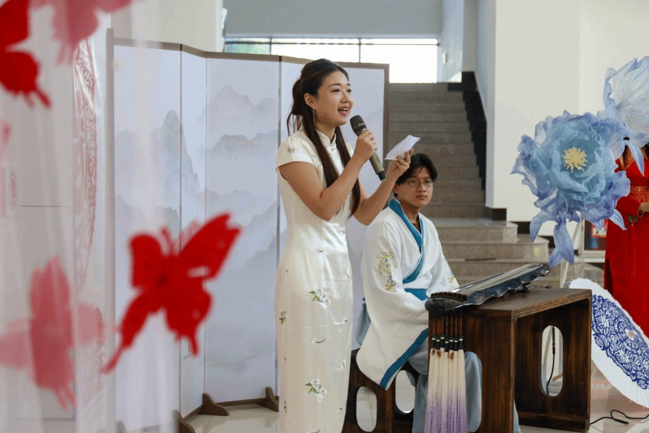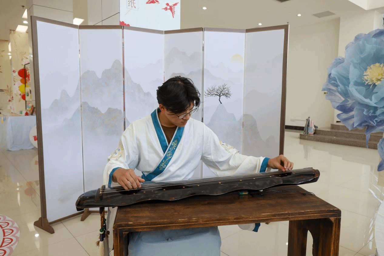 活动在悠扬的古琴声中拉开帷幕。作为中国传统文化“琴棋书画”四艺之首,古琴以其清微淡远、意境悠长的音色,瞬间将观众带入宁静致远的东方美学世界。在团队核心成员、教育学院孙晓鹏老师的悉心指导下,来自“中文+古琴”课程的7名优秀留学生学员依次登台,指尖流淌出经典古琴曲目。他们不仅展现了从零基础起步习得的精湛指法,更用简短的中文分享了学习感悟和曲目意境,将语言学习与艺术实践完美融合,赢得现场阵阵掌声。