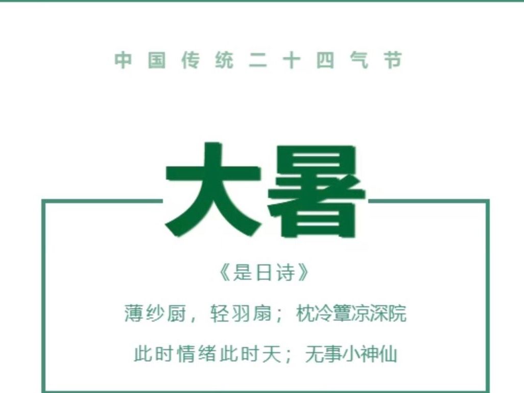 大暑,二十四节气之第十二,夏季的尾声。太阳达黄经120°时交节,通常在公历7月22日-24日。大暑正值“三伏”中的“中伏”前后,是一年中最炎热的时期,“大暑”即“大热”之意。此时阳光猛烈,高温酷热,雷暴、台风频繁。“小暑大暑,上蒸下煮”等谚语生动描绘了此时湿热难耐的特点。 习俗:一、饮伏茶: 为消暑防病,民间有饮“伏茶”习俗。伏茶由多种中草药(如金银花、甘草)煮成,常免费供应路人,清凉解渴。二、烧伏香: 人们在大暑焚香祈福(...